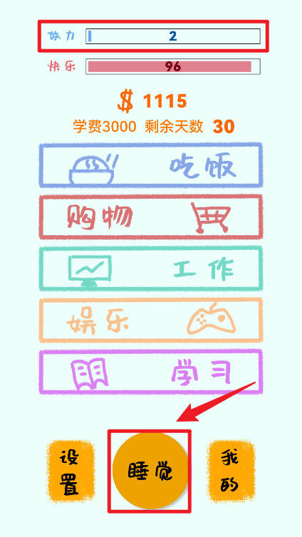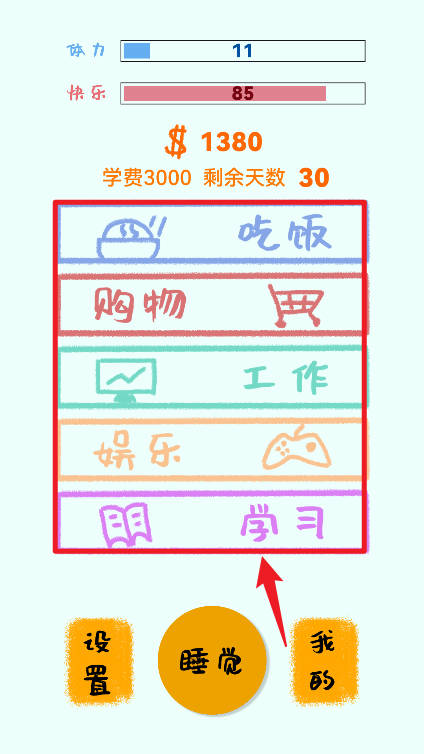 1、点击合理安排吃饭购物工作娱乐学习五项活动。