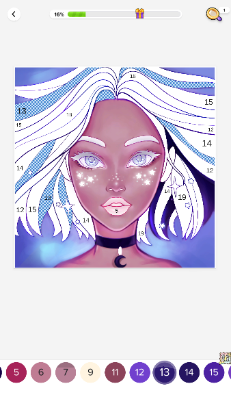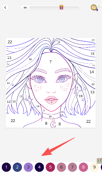 3、先点底部色盘上的数字1,再给标记1的图案区域上色,像寻宝一样简单有趣。