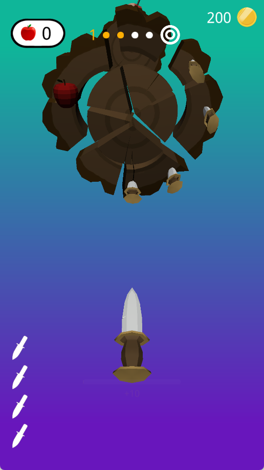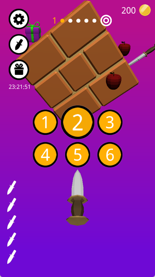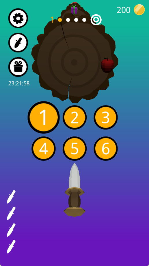 1、操控飞刀瞄准转动的木桩,将关卡要求数量的飞刀精准射击并扎在木桩上。