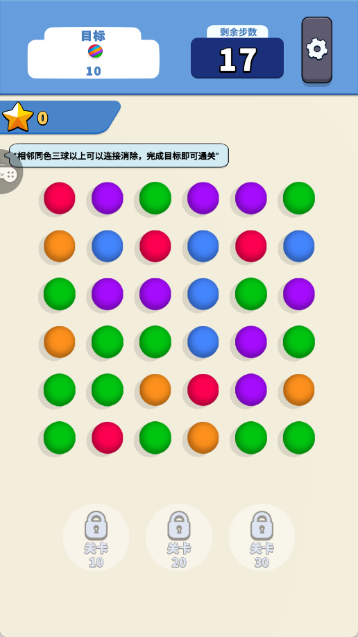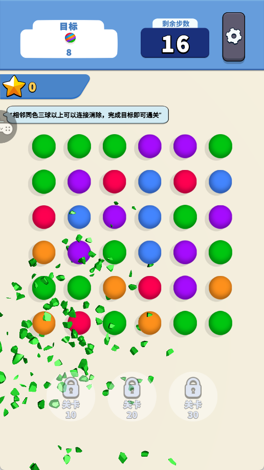 2、用手指画线连接 3 个及以上同色相邻球球,触发消除效果,直至清除所有球球。