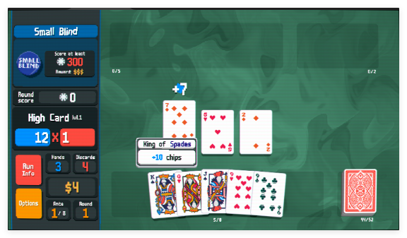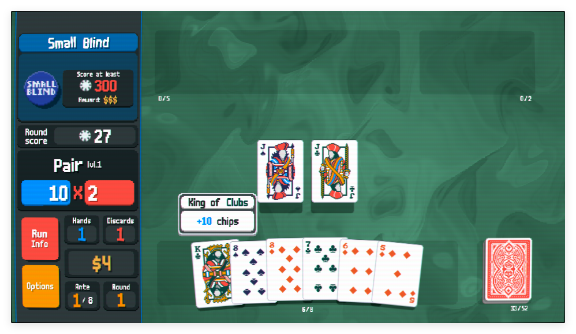 1、进入游戏后,从标准52张扑克牌组开始,每回合抽取手牌,通过组合对子、顺子等牌型获取筹码与倍率,达成关卡目标得分。