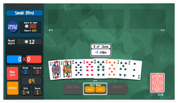 3、面对小盲注、大盲注及BOSS盲注关卡,合理运用弃牌机制调整手牌,凭借搭配成型的牌组突破分数要求,推进闯关进程。