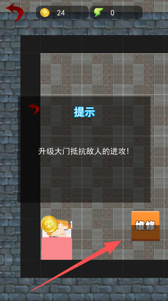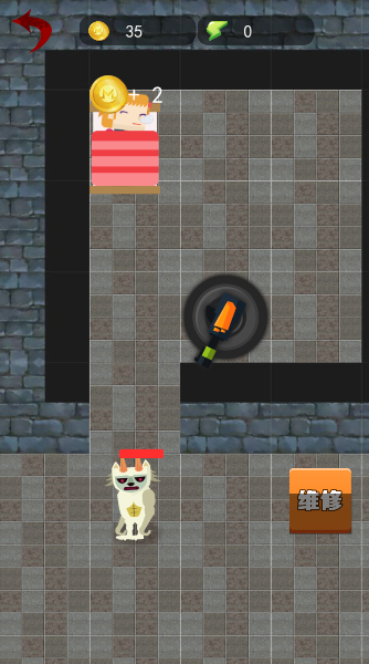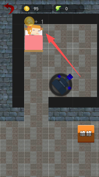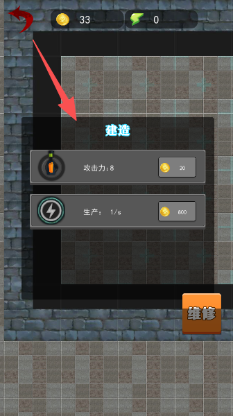 2、点击空地板打开建筑菜单,选个炮台或障碍物挡住鬼的路线。