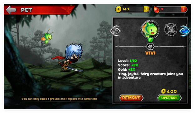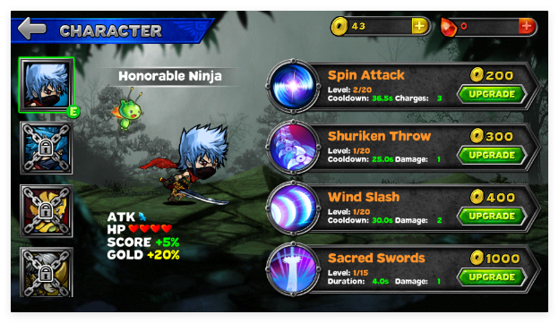 1、进入游戏后选择心仪忍者角色,搭配初始武器与萌宠,通过滑动屏幕躲避障碍、触发攻击动作。