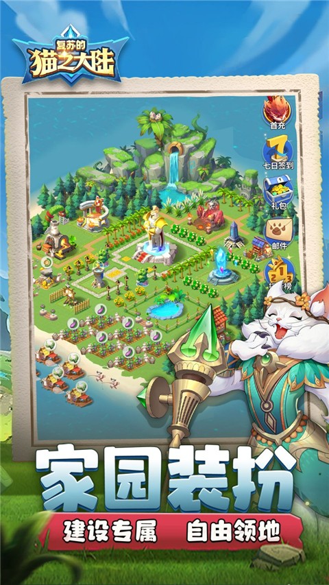 1、进入游戏解锁初始猫族英雄,熟悉放置战斗机制,在静谧岛屿建造农田、渔场积累资源,完成新手任务解锁属性克制规则与基础阵容搭配。
