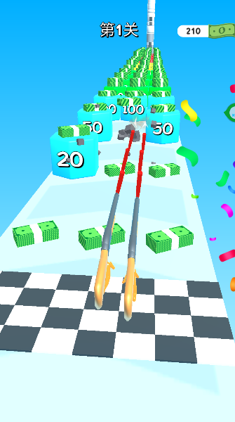 2、操控武器去接住加分道具提升威力,灵活躲开那些会让自己变弱的坏道具。