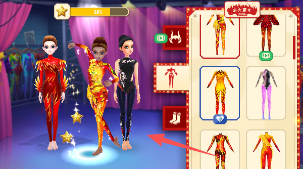 2、在衣帽间为演员挑选华丽的火焰主题演出服,搭配好后点确认,闪亮登场。