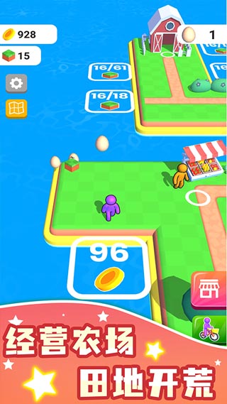 2、搭建棚舍养殖牛羊鸡等畜禽获取蛋奶,前往海岸捕鱼丰富产品类型,将收获物存入仓库或直接出售给商户换收益。