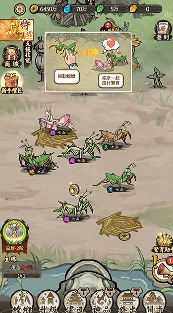 1、福利丰厚易上手,登录即获神品螳螂,低阶个体可作养料或繁育素材,零投入也能快速组建强力军团。