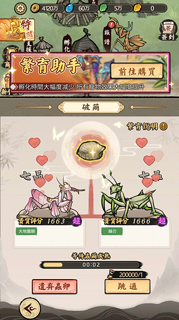 2、螳螂可以拖动来进行繁殖,成功后会有金币。