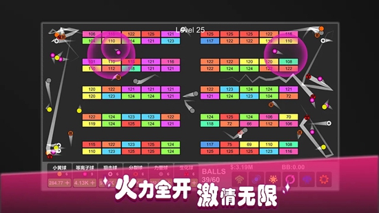 2、消除砖块获取金币与道具,利用资源解锁不同特性的小球,升级攻击力、分裂等属性,强化闯关能力。