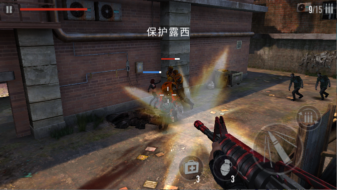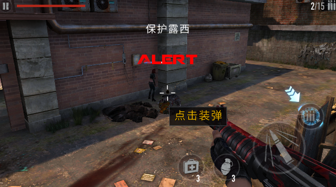 2、按任务指引找到受困的露西,用火力压制靠近她的僵尸,子弹耗尽时快速换弹,利用木箱掩体躲避突袭。