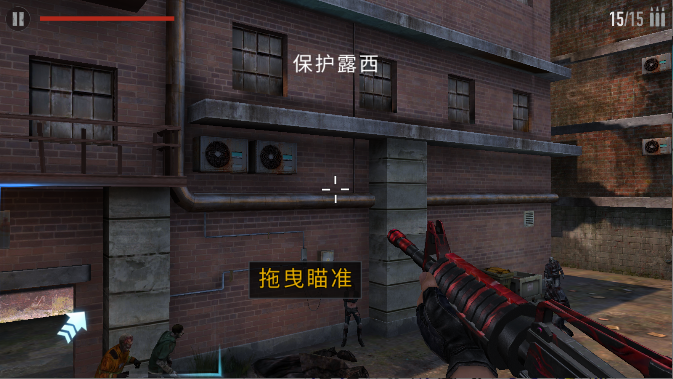 1、初始装备基础步枪进入城市废墟,瞄准僵尸头部射击。