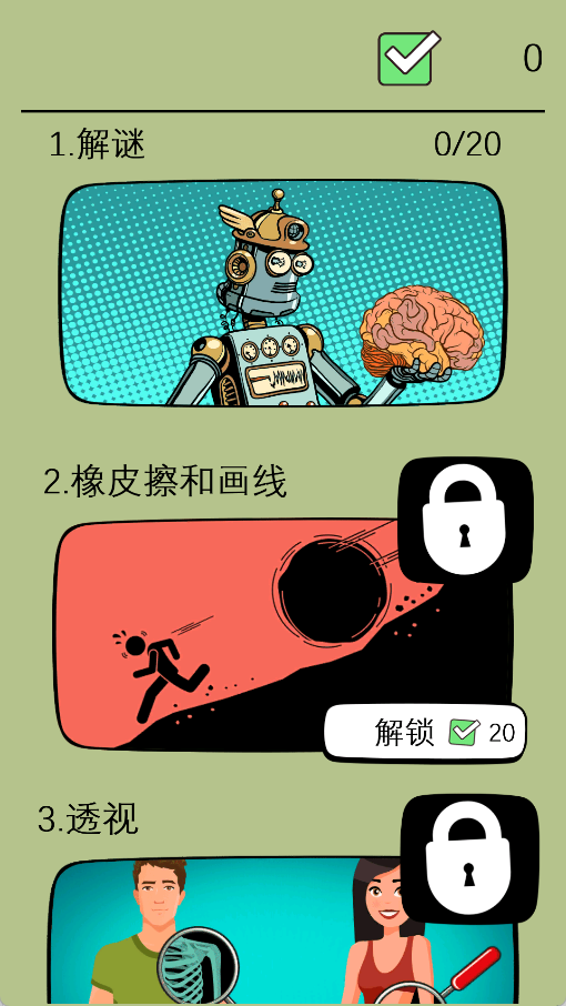 《脑洞奇迹》是一款主打非常规思维的益智休闲闯关游戏。核心玩法为破解各类脑洞谜题,需摆脱常规思考模式,通过拖拽、擦除、画线、拼图等多样操作通关。游戏包含大量关卡,每个关卡设定独特谜题与过关方式,融入几何图形还原、趣味答题等元素,搭配欢乐剧情与惊喜彩蛋,操作轻松易上手,兼具魔性互动乐趣与脑力挑战,适合休闲时锻炼思维灵活性。