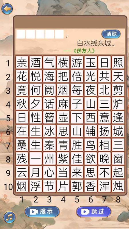 1、进入关卡后查看诗词题干与空缺位置,从候选汉字中选择匹配内容填入,结合诗词语境推导答案,筑牢答题基础逻辑。
