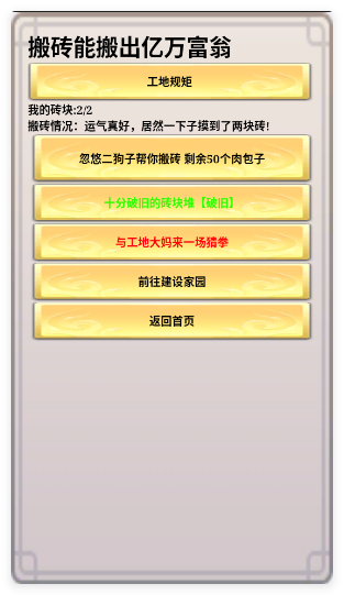 《一起来搬砖》是一款主打文字剧情的点击放置游戏,以“搬砖”隐喻打工奋斗历程,开启从工地打工仔到世界首富的逆袭之旅。游戏开局可选择富贵人家、武学世家、法师种子、旅行爱好者四种天赋,不同天赋对应不同属性加成与发展路径,融合养成RPG元素,通过点击操作积累硬币、提升实力,建设家园、购置豪车,实现逆天改命的暴富梦想。