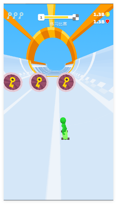 1、进入游戏后,点击开始按钮即可开启竞速之旅,通过左右滑动屏幕操控角色变换赛道,躲避沿途障碍。