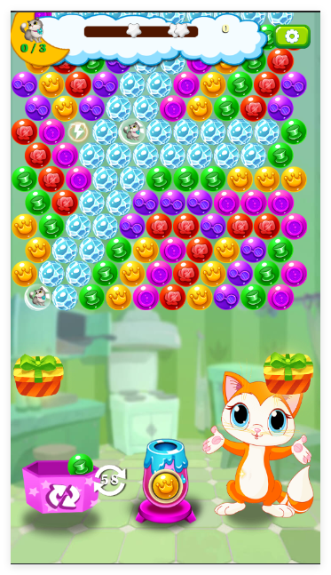 2、点击屏幕触发发射,让泡泡沿瞄准轨迹飞行,与相同颜色的泡泡相连,逐步凑齐三个及以上同色泡泡的消除条件。
