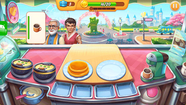 1、跟随引导完成松饼等基础菜品制作,熟悉食材搭配与烹饪流程,按顾客订单快速上菜获取收益,筑牢经营基础。