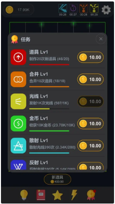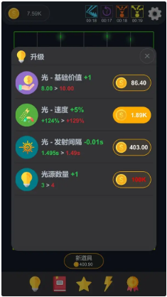 1、采用放置核心玩法,无需实时操控,离线状态下光路也会自动运转积累进度,上线后可收集光影能量,解锁更多光学元件。