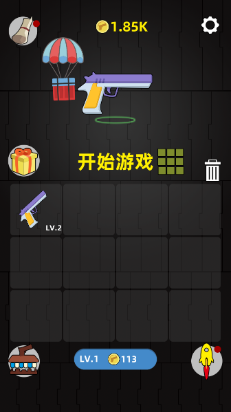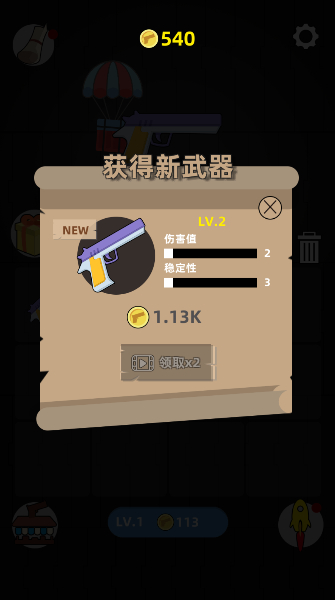 1、游戏里两把小手枪一碰头,就能“叮”的一声合体,变成一把更厉害的新武器,试试手气吧!