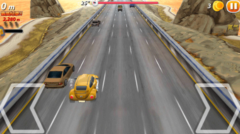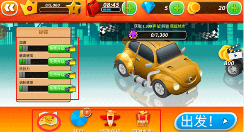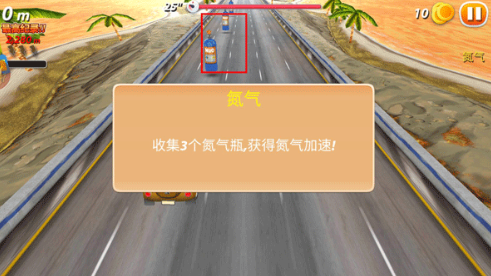 1、从车库挑选适配赛道的车型,熟悉虚拟按键或重力感应操控。