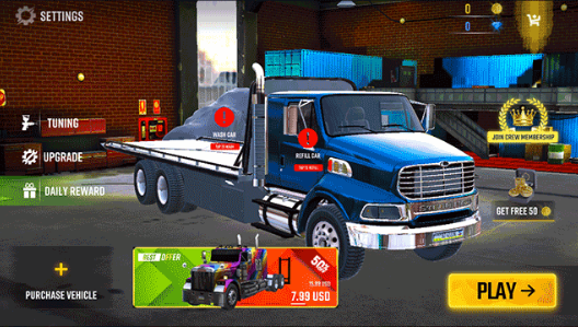 1、从车库挑选适配货运的重卡,点击play进入游戏。