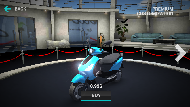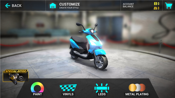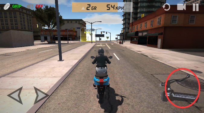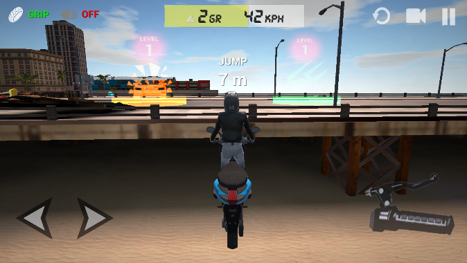 1、从车库挑选适配场景的摩托,熟悉重力感应或虚拟按键操控。