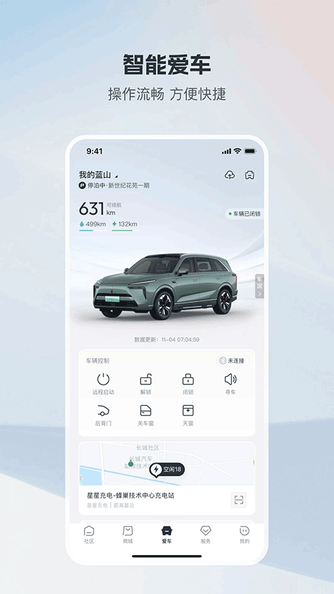 3、跨品牌车控操作:绑定车辆后,实现跨品牌远程车控。可远程启动、熄火,提前开启空调调节车内温度。远程解锁、锁车,方便临时用车。还能实时查看车辆位置、剩余油量、续航里程等状态 。