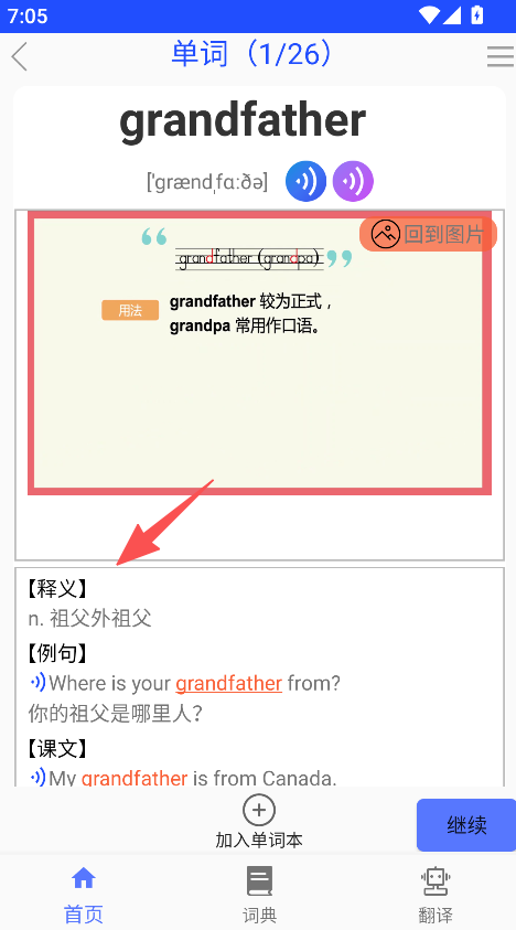 3、查看单词的读音、释义、例句,可加入单词本,继续学习。