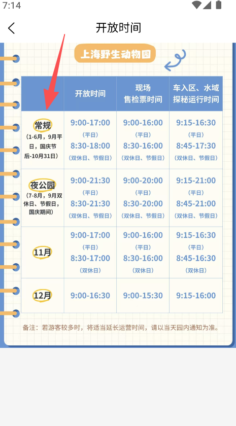1、具备开放时间查询功能,可查看上海野生动物园常规、夜公园及各月的开放、售检票时间,助力游客规划游园时间。
