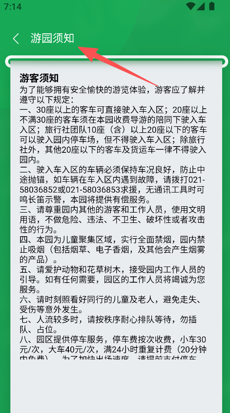 2、点击 游园须知,了解入园车辆、行为规范等游园注意事项。
