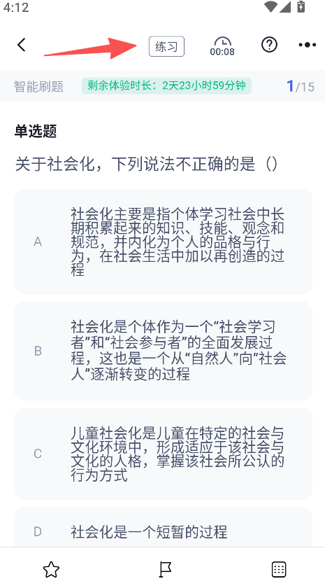 1、打开软件,点击智能刷题板块,进入练习页面。