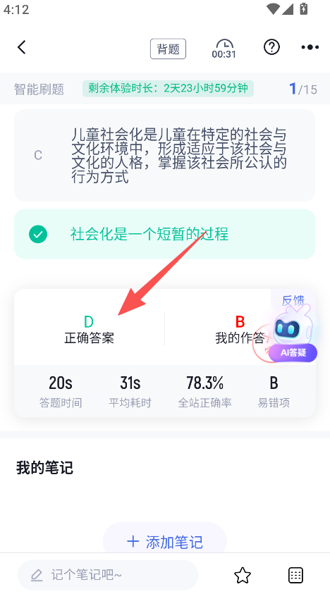 3、完成答题后,查看正确答案及解析,学习知识点。