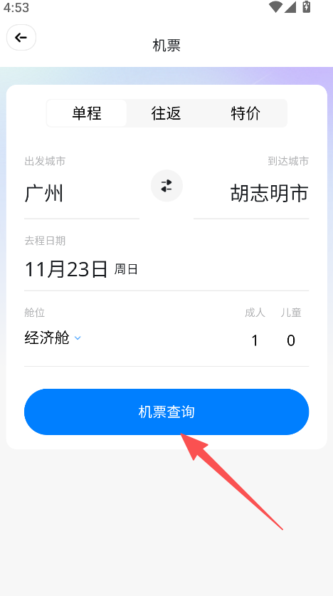 3、选择机票选项,填写行程信息后点击查询。