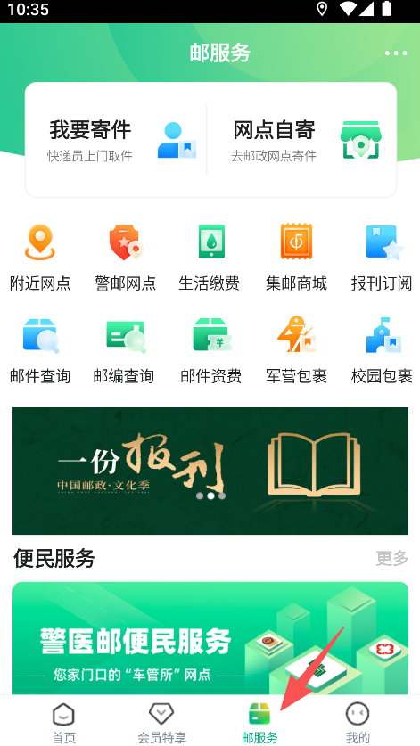2、支持邮服务功能,切换至邮服务板块选择我要寄件,可发起快递员上门取件的请求,完成寄递操作。