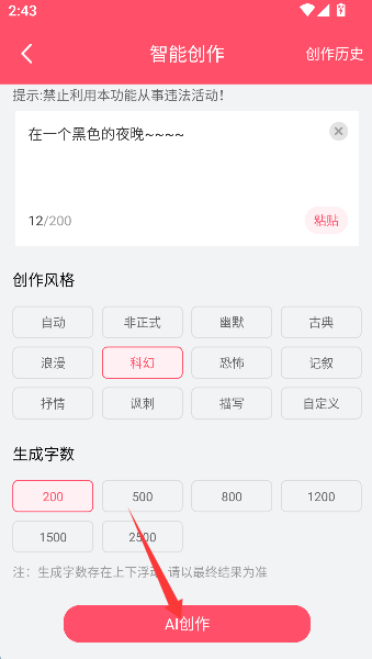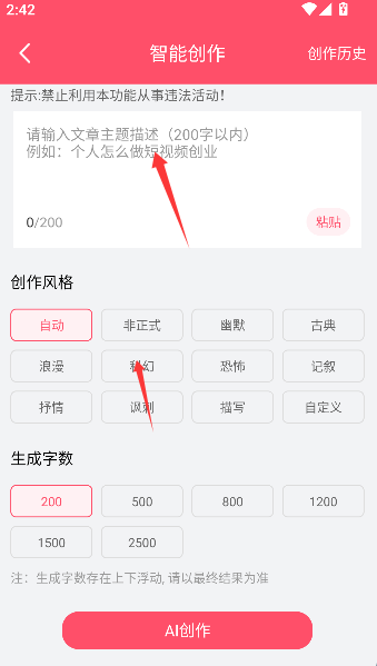 1、点击“文章创作”按钮,仿佛唤醒一位隐藏在手机里的资深编辑,准备将您的灵感付诸文字。