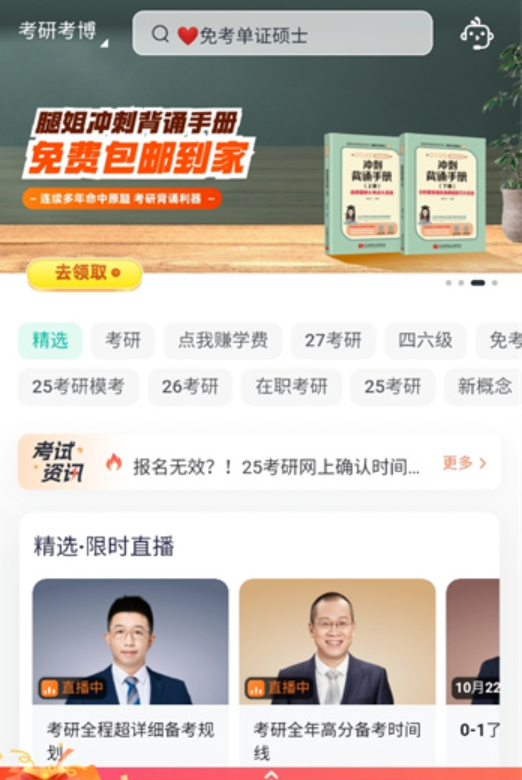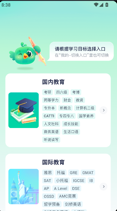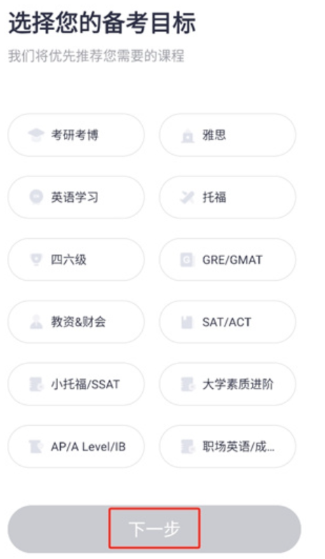 1、 在应用主界面,通过点击不同的选项入口,选择个人的备考目标。
