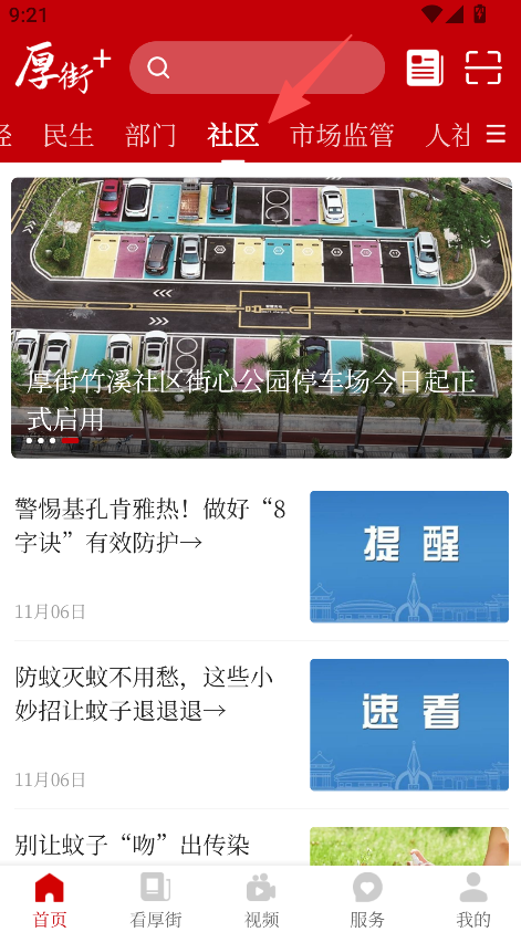 1、具备本地资讯展示功能,分社区等板块,呈现厚街本地停车场启用、健康防护、生活技巧等动态及实用资讯内容。