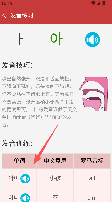 1、发音学习项配备详细的发音技巧说明与口腔结构图示,同时搭配对应单词的中文意思及罗马音标,能直观掌握发音方式与应用场景。