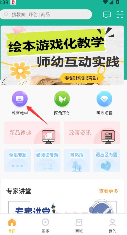 1、找到并点击“教育教学”功能入口,进入教育教学资源主页面。