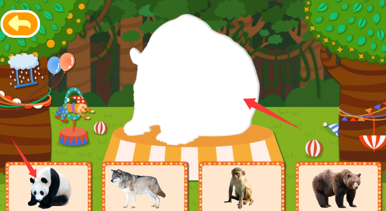 2、根据出现的动物轮廓提示,从备选答案中找到正确的动物图像,并将其拖拽至轮廓框内完成配对。