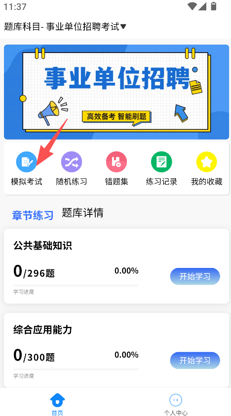 1、题库科目明确为事业单位招聘考试,功能分类包含模拟考试、随机练习、错题集等,板块划分清晰,适配该考试的备考场景。