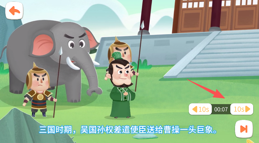 1、提供成语故事查看功能,在首页选择对应章节的成语故事(如曹冲称象),进入故事页面观看配套的图文动画内容。