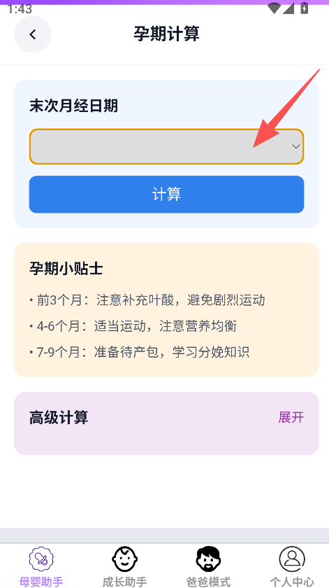 2、孕期计算功能设计贴合实际需求,需通过选择末次月经日期开展计算,操作流程贴合孕期记录的常规方式,同时呈现对应阶段的护理建议。