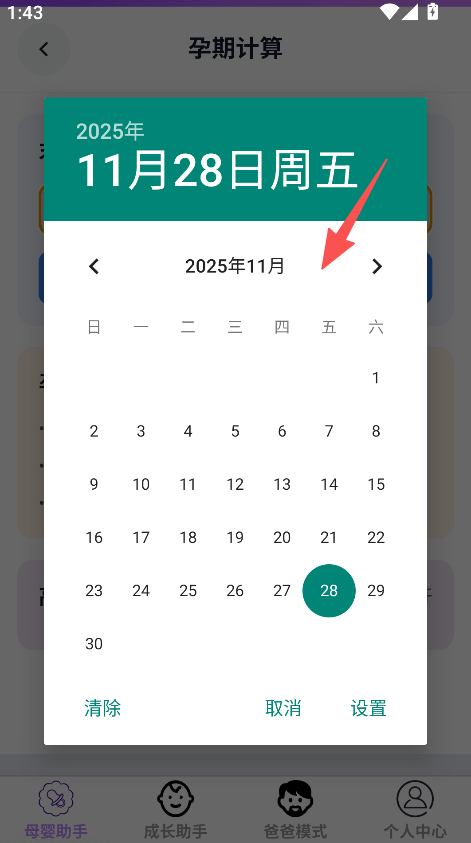 3、实现日期选择功能,在孕期计算的日期选择界面,通过日历选定对应日期,点击设置按钮完成选择,为孕期计算提供基础数据支持。