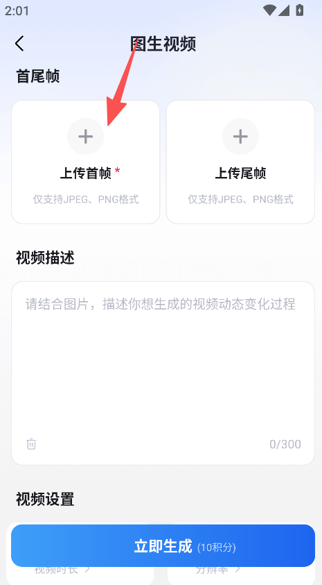1、支持图生视频功能,进入对应页面后点击上传首帧按钮,在相机胶卷中选择图片完成上传,为视频创作提供首尾帧的素材基础。