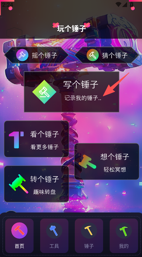 《玩一个锤子》是一款锤子主题的工具类软件,含写个锤子、转个锤子等功能,写个锤子可记录内容,操作时点击写个锤子进入记事本,再点添加填写事件主题与内容,还设趣味转盘等工具,功能丰富且风格统一,适配日常记录与休闲使用。