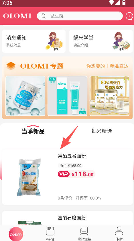 《蜗米商城》是一款购物类软件不含标点符号和空格,设搜索栏、消息通知、蜗米学堂等板块,OLMI专题展示各类商品,当季新品呈现富硒五谷面粉等好物,点击商品可查看成分、加工方式、规格等详情,标注原价与VIP价,支持加入购物车或立即购买,贴合日常购物需求。