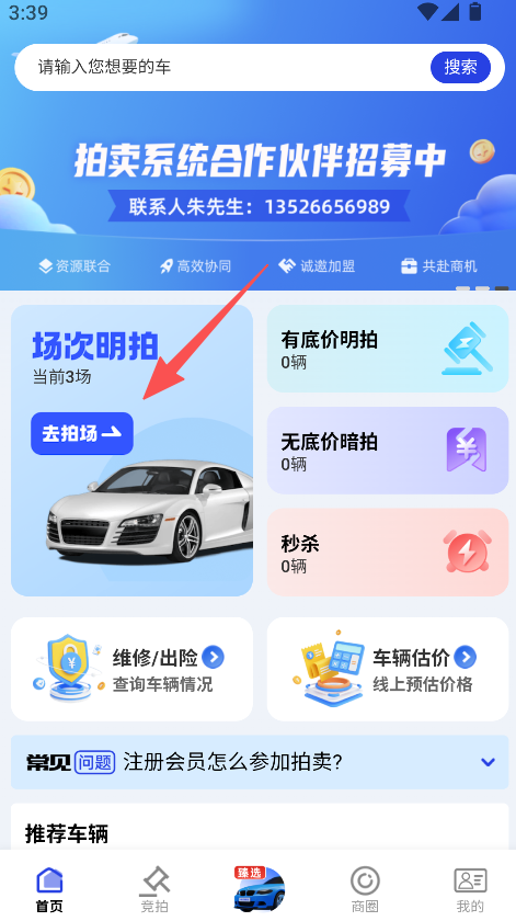 1、打开车联拍首页,点击场次明拍的去拍场。